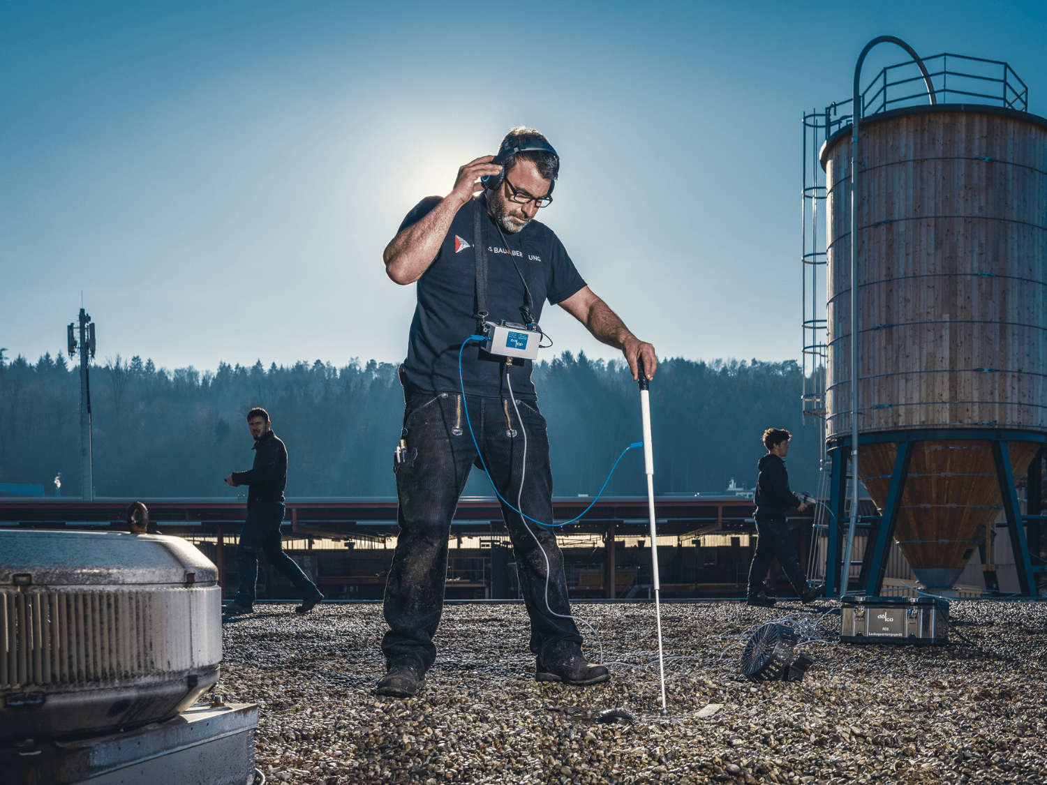 Mit dem Elektro-Akustik-Verfahren finden wir Leckagen exakt und effizient – selbst auf grossen Flächen oder bei komplexen Abdichtungen.