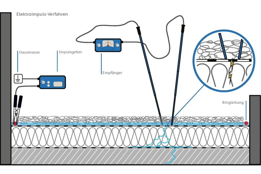 Das Kernstück des Elektroimpuls-Verfahrens ist der Einsatz eines Elektroimpulsgebers, der mit einer im Randbereich der zu untersuchenden Fläche verlegten Ringleitung verbunden wird. Nach der vollständigen Benetzung der Dachfläche mit Wasser sendet der Impulsgenerator einen Gleichstromimpuls von minus 40 Volt über die Ringleitung, wodurch ein elektrisches Potential auf der wasserdurchtränkten Fläche erzeugt wird. Mithilfe eines Spezialmessgeräts detektieren wir anschliessend Potentialunterschiede, um den exakten Pfad des Stroms zur defekten Stelle zu ermitteln und das Leck zu identifizieren. Sobald eine Leckage identifiziert ist, reparieren wir sie oder grenzen sie mit einer kleinen Ringleitung ab, um ihre Auswirkung auf weitere Messungen zu eliminieren. So setzen wir die Untersuchung der restlichen Dachfläche ungestört fort.