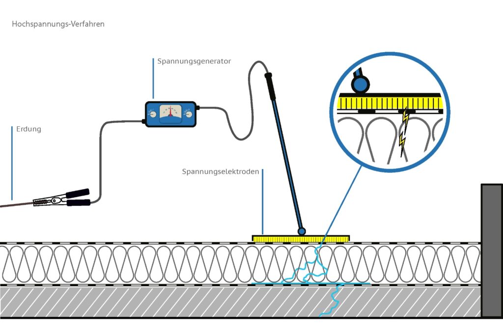 Wir führen eine Elektrode, die an ein Hochspannungsgerät angeschlossen ist, über die trockene, vorbereitete Dachoberfläche. Die Höhe der elektrischen Spannung richtet sich dabei nach der Schichtdicke. Ein Erdungskabel, angebracht an der Dachmembran, schliesst den Stromkreis. Bewegt sich die Elektrode über eine beschädigte Stelle, wo der elektrische Widerstand durch Risse oder Löcher verringert ist, springt aufgrund der Hochspannung ein Funke über. Dieser Funkenüberschlag wird vom Gerät registriert und signalisiert die exakte Position der Undichtigkeit.